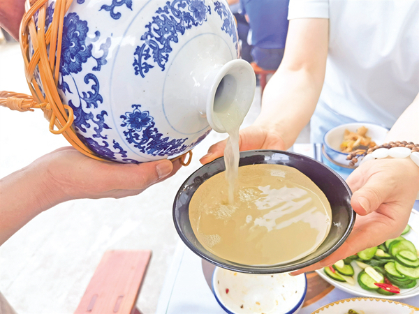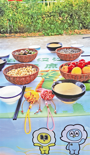 今年的漢江排子席是在復原的基礎上完善創新,有過安康門、開席、演唱漢江號子、安康非遺展示等多個環節。菜色方面,有四碗柱子果寓意四平八穩,插放梔子花、石榴花,寓意祥符瑞氣、多子多福,一壇黑陶稠酒,上放扎紅飄帶竹制酒提,開席后由祝酒仙子用酒提從酒壇斟酒。