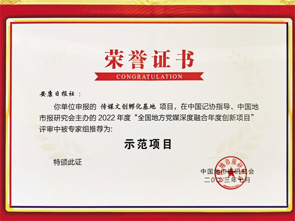 7月9日,全國地市媒體全媒體傳播體系建設(shè)推進(jìn)大會(huì)在內(nèi)蒙古烏蘭浩特市舉行。會(huì)上,對(duì)第二屆全國地方黨媒融合發(fā)展創(chuàng)新項(xiàng)目進(jìn)行了表彰,安康日?qǐng)?bào)社的《傳媒文創(chuàng)孵化基地》獲“示范項(xiàng)目”大獎(jiǎng),此獎(jiǎng)項(xiàng)陜西共兩家媒體通過評(píng)審獲獎(jiǎng)。