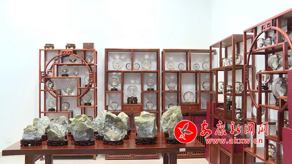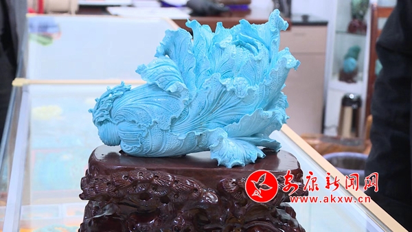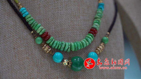松石展柜中,擺放著各類精致時尚的綠松石飾品,這些通過雕刻家設計打磨后的擺件、項鏈、手鏈、耳墜等,都是藝術(shù)臻品,它們吸引著人們的目光,讓人愛不釋手。