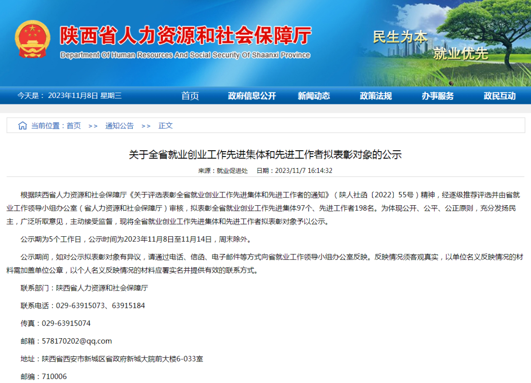 近日,陜西省人力資源和社會保障廳網站公布《關于全省就業創業工作先進集體和先進工作者擬表彰對象的公示》,對擬表彰的97個全省就業創業工作先進集體和198名先進工作者名單進行公示。其中,我市5個集體、11名個人入選。具體如下: