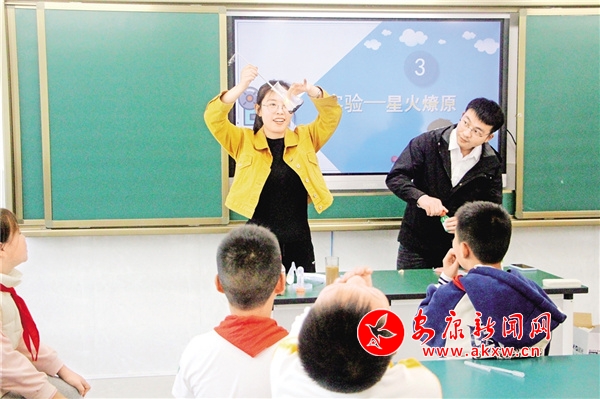 安康學院化學化工學院青年教師王雪博士、金成召博士為學生演示木棒復燃實驗。 吳風軍 攝