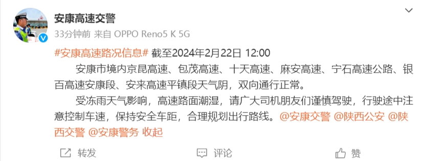 據(jù)安康高速交警消息:截至2024年2月22日12:00,安康市境內(nèi)京昆高速、包茂高速、十天高速、麻安高速、寧石高速公路、銀百高速安康段、安來高速平鎮(zhèn)段天氣陰,雙向通行正常。受凍雨天氣影響,高速路面潮濕,請廣大司機朋友們謹慎駕駛,行駛途中注意控制車速,保持安全車距,合理規(guī)劃出行路線。 hKJ安康新聞網(wǎng)