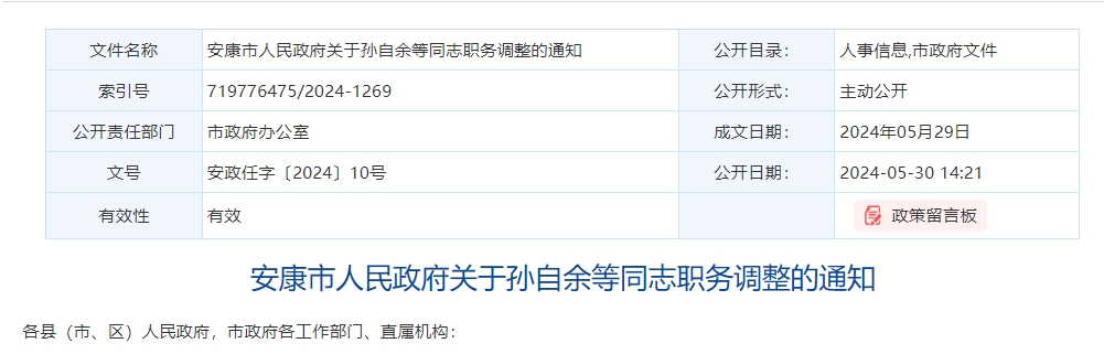 安康市人民政府關(guān)于孫自余等同志職務(wù)調(diào)整的通知