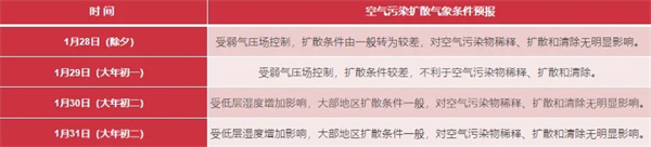 1月24日至27日,受雨雪降溫天氣影響,擴散條件較好。1月28日至29日,地面氣壓場轉弱,擴散條件轉差,我市大部空氣質量以良至輕度污染為主,煙花爆竹集中燃放時段可能出現短時重度或以上污染,首要污染物為PM2.5。1月30日至31日,受低層濕度增加影響,擴散條件一般。2月1日至4日,受冷空氣清除作用影響,擴散條件較好。