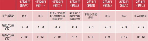 春節期間,除夕至初一,天氣晴朗,適宜出行游玩,但早晚氣溫低,注意適時增減衣物。初二至初四云量較多,有分散性小雨或雨夾雪,高山地區有小雪,去高山景區的公眾需注意做好防寒保暖和防滑措施。