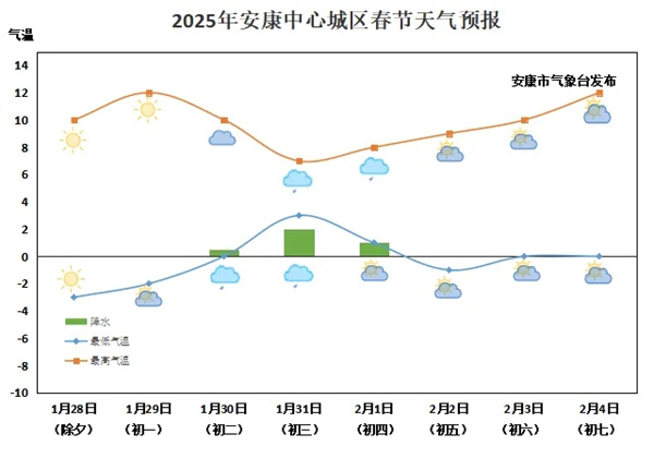 據悉,春節前期(除夕到初一),我市以晴天到多云天氣為主;初二到初四我市大部陰天,中南部有分散的小雨或雨夾雪,高山地區有間歇性小雪;初五到初七天氣轉好。預計春節期間川道地區:-3~12℃,高山地區:-7~9℃,最低氣溫整體較低:川道地區-3~4℃,秦巴山區-7~2℃。