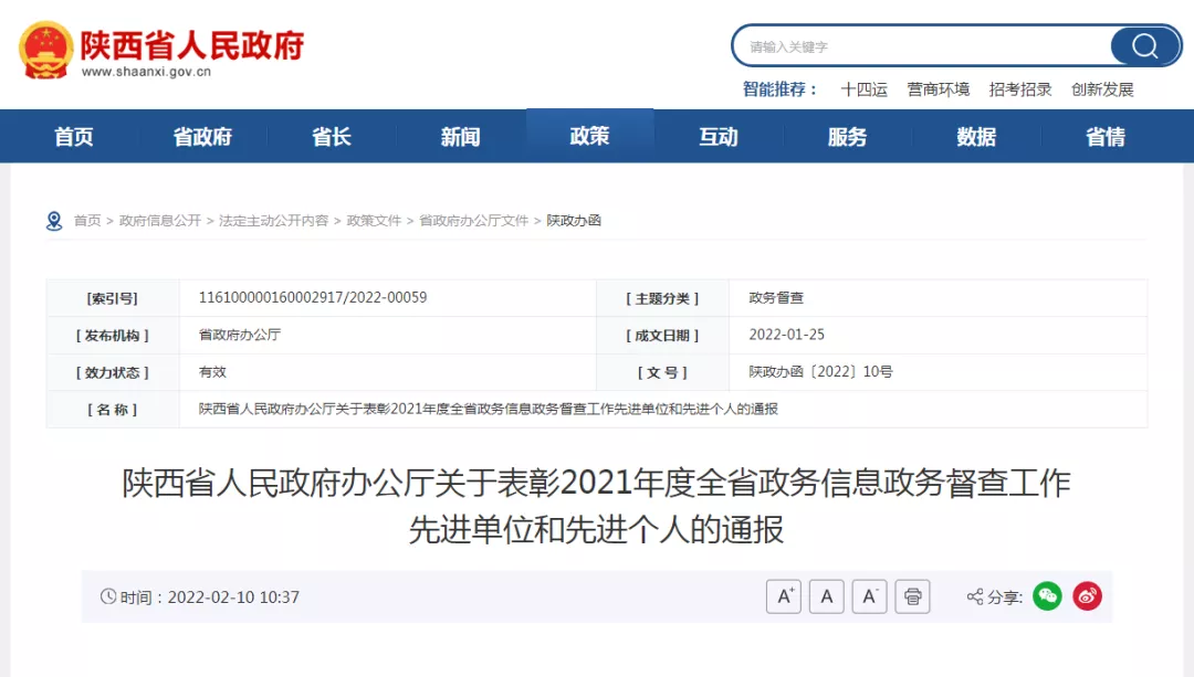 近日,省政府辦公廳印發《關于表彰2021年度全省政務信息政務督查工作先進單位和先進個人的通報》。安康市人民政府辦公室(市政府督查室)、漢陰縣人民政府辦公室……
