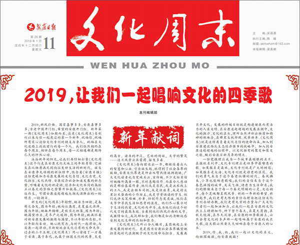 2019,新風撲面。國家喜事多多,安康喜事多多,古老中國開門紅,希望的安康開門紅。新年第一期《文化周末》如期而至,這是《文化周末》自創刊以來與你一起度過的……