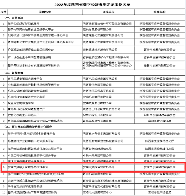 本網訊(通訊員 張騫)近日,陜西省發(fā)展和改革委員會發(fā)布了《關于公布2022年度陜西省數字經濟典型示范案例的通知》,由安康市發(fā)改委推薦,中國建設銀行援建,安康大數據公司承建的“安康市數字鄉(xiāng)村服務與治理平臺”成功入選。