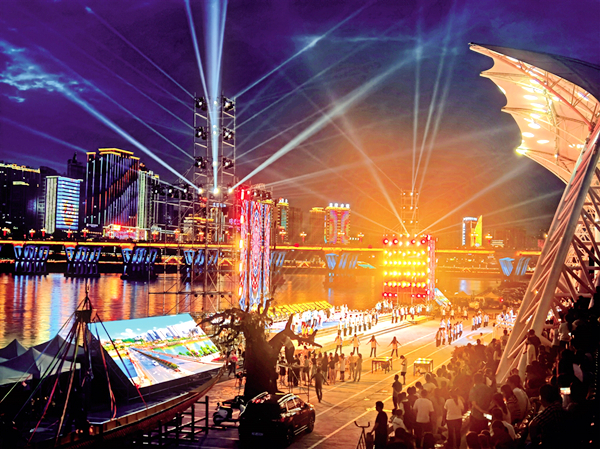 為保證第二十三屆中國安康漢江龍舟節舞臺夜間燈光照明及燈光秀,6月19日,燈光師正在加緊調試燈光。陳德模 攝hRd安康新聞網