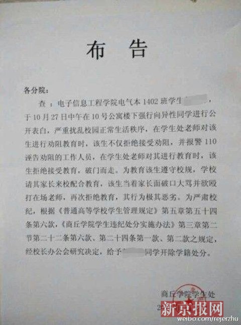 新京報快訊(記者 程媛媛 實習生 顧開貴 趙吉翔)今日(11月10日),河南商丘學院一份“布告”在網上流傳,“布告”稱該校男生郭某“強行”向異性表白,嚴重擾亂校園秩序,校方依據相關規定給予郭某開除學籍處分。該校多名學生向新京報記者證實校內多個分院均貼有此布告。