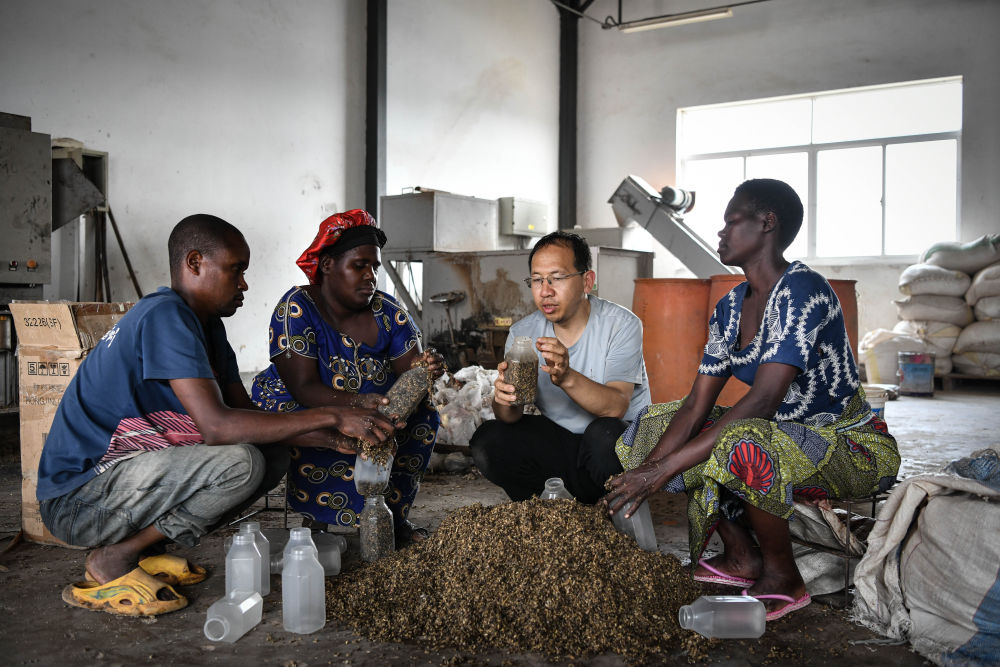 2024年8月13日,在盧旺達南方省胡耶區的中國援盧農業技術示范中心,菌草專家陳曉斌(右二)與當地農民一起制作菌種培養料。新華社記者 韓旭 攝
