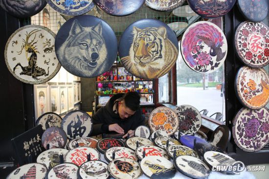 12月13日,西安大雁塔景區,22歲小伙陳鵬聚精會神地在一塊圓形木板上雕刻著。他的面前掛滿了一幅幅大大小小的木版畫,其中的老虎和狼毫發畢現,活靈活現,雕刻的十分精細。