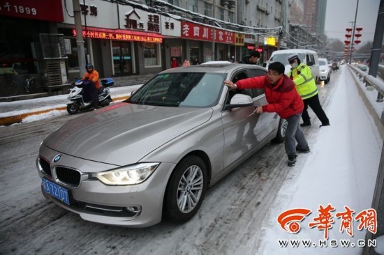 1月4日在西安市咸寧路上,雪后路面太滑,紅燈停下后,寶馬車打滑都無法起步。 華商記者 鄧小衛 攝影報道