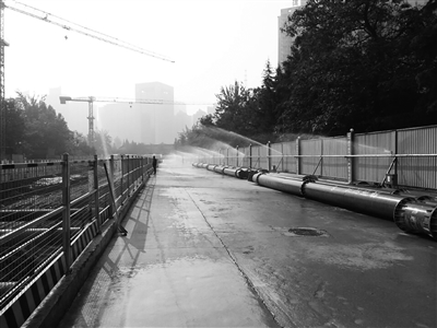 在西安地鐵五號線6標(biāo)中鐵電氣化局施工的高新四路車站工地記者看到,作為西安地鐵首批噴淋系統(tǒng)試驗點,施工單位將防塵減霾噴淋系統(tǒng)安裝在工地圍欄1.5米高位置,管線長度達(dá)680米,噴頭68個,其中,每10米設(shè)置一個旋轉(zhuǎn)噴頭,噴射射程最大可至12米,覆蓋的面積約3000多平方米。每個噴頭上設(shè)置有閥門,可根據(jù)現(xiàn)場情況,調(diào)節(jié)射程、水量及角度。