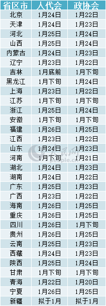 | 注:資料來源于各省日報,人大、政協(xié)網(wǎng)站或當(dāng)?shù)匦麄鞑块T,內(nèi)容截至1月5日,實際時間以當(dāng)?shù)貢h召開時間為準(zhǔn)。 |