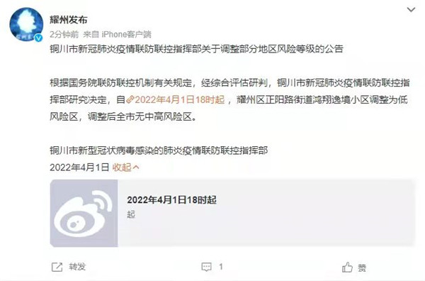 根據國務院聯防聯控機制有關規定,經綜合評估研判,銅川市新冠肺炎疫情聯防聯控指揮部研究決定,自2022年4月1日18時起 ,耀州區正陽路街道鴻翔逸境小區調整為低風險區,調整后全市無中高風險區。gyV安康新聞網