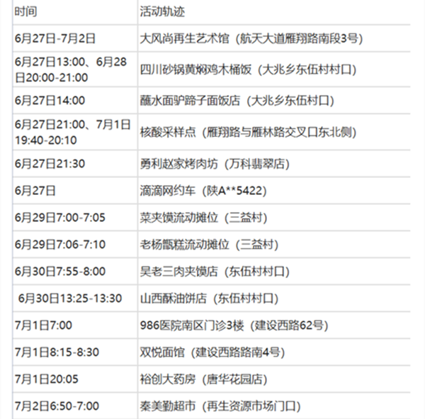 7月2日0-18時,西安市新增1例本土確診病例,系重點人群核酸篩查中發現。6月19日、21日、24日、28日核酸檢測結果均為陰性,7月2日7時40分混檢結果異常,7月2日13時,西安市疾病預防控制中心單檢結果陽性,經市級專家組診斷為確診病例(輕型),主要活動軌跡如下:au7安康新聞網