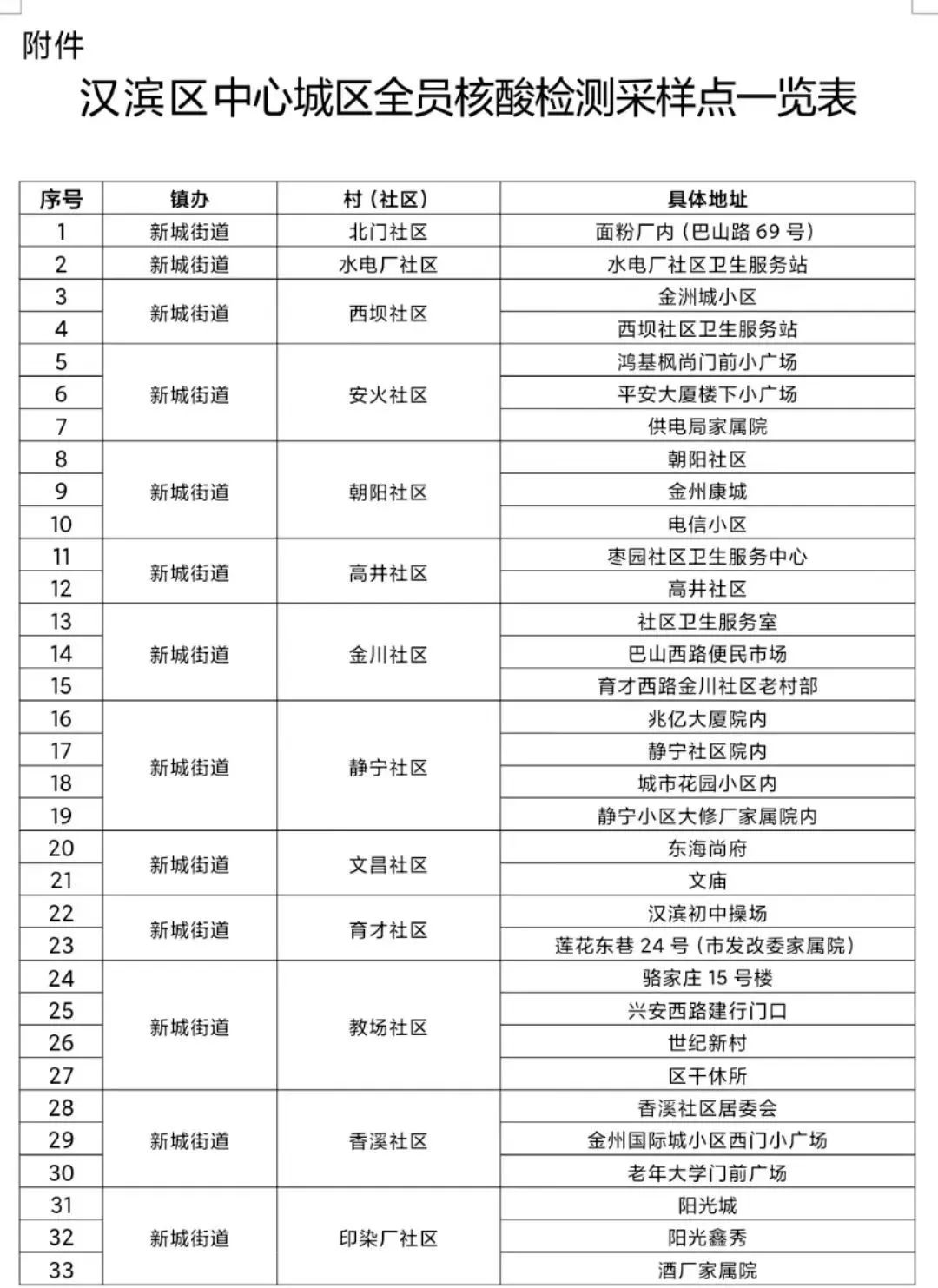 漢濱區老城街道、建民街道、新城街道、江北街道及關廟鎮、吉河鎮中心城區范圍(具體見附件所列村、社區)常住和流動人員一律參加核酸檢測。