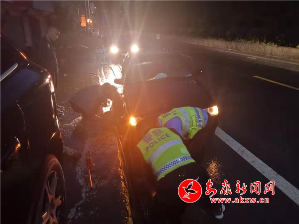 本網(wǎng)訊(通訊員 翁玲 蘆寶)2019年9月17日晚八點(diǎn)左右,風(fēng)雨交加,嵐皋縣公安局交警大隊(duì)香河口中隊(duì)民警在轄區(qū)夜間巡查,巡邏至G211國(guó)道1081公里處,發(fā)現(xiàn)一輛渝A牌照的小型轎車輪胎卡在路面溝渠里不能移動(dòng),加之雨夜視線差,路面濕滑,過路車輛多,十分危險(xiǎn)。
