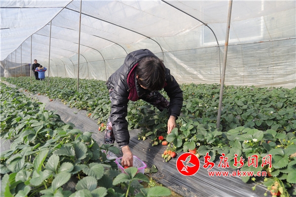 12月29日,恰逢周日,天氣晴好。筆者在嵐皋縣城關鎮茅坪村眾達現代農業園區看到園區停滿了車輛,草莓日光大棚里暖意融融,濃綠的草莓枝葉間,長出一顆顆鮮艷的草莓,草莓的香味撲鼻,格外誘人。不少游客帶著小孩正在熱熱鬧鬧地體驗采摘草莓的樂趣。