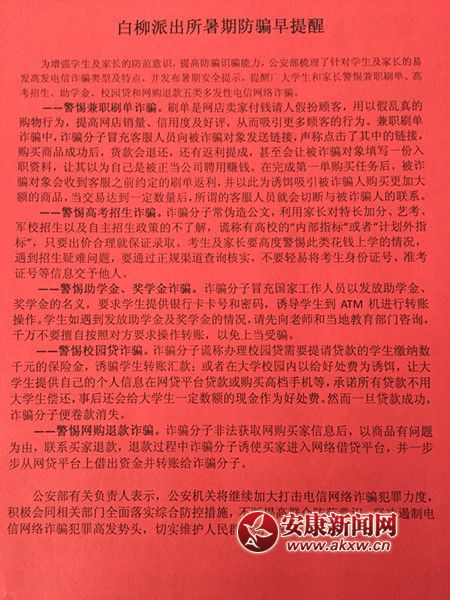 安康新聞網(wǎng)訊(通訊員 康倩)暑假,本是學(xué)生放松與家人相聚的溫馨時(shí)刻,但年年暑假都有很多不法分子,鉆了學(xué)生涉世未深,輕易相信他人的空子,對(duì)學(xué)生實(shí)施諸如發(fā)放助學(xué)金、暑期兼職等類型的電信詐騙。對(duì)此白柳派出所專門針對(duì)此類電信詐騙在轄區(qū)進(jìn)行了廣泛宣傳,不僅學(xué)生需注意,家長(zhǎng)更需警惕。