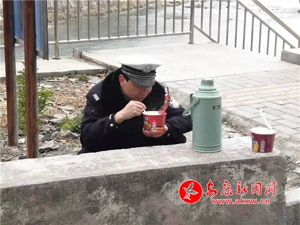 和她一樣的女漢子還有活躍在縣醫(yī)院十字路口處的王金、向婷,站在崗位上一刻她們就要圓滿完成這一刻的任務(wù)。疏導(dǎo)行人和車輛,確保縣醫(yī)院應(yīng)急通道的暢通,在她們心里那就是天職,連吃飯也一直在附近移動警務(wù)車里輪流火速解決。