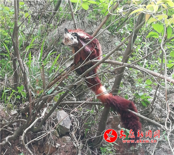 石章明第一時間聯系了縣林業局,工作人員立即趕到護林站,看見這個小動物全身毛色發亮,棕紅色與白色相間,拖著一條酷似松鼠一樣的大尾巴,頭又圓又小,眼睛大,眼圈赤栗色,體長1米多,尾巴長度超過體長。經過現場查看、圖片比對,并和市林業局聯系,最終確認這就是國家有益、有重要經濟、有科學研究價值的“三有”保護野生動物——飛狐。隨即,林業工作人員對這只飛狐進行了全面體檢救治。