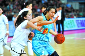 北京首鋼隊(duì)球員邵婷(右)在比賽中進(jìn)攻。 新華社記者 詹彥攝