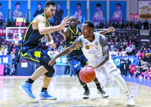 新疆隊球員亞當斯(右一)在與廣東隊比賽中運球突破。 新華社記者 王 菲攝