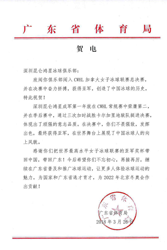人民網3月26日電 北京時間3月26日零時,CWHL(加拿大女子冰球職業聯賽)克拉克森杯總決賽打響,由深圳昆侖鴻星對戰萬錦迅雷隊。本場比賽,昆侖鴻星第一節先失一球,第二節由史塔克將比分扳平。加時賽中,萬錦迅雷隊斯塔西打入絕殺球,最終昆侖鴻星以1-2加時憾負萬錦迅雷隊,但獲得亞軍仍然是中國冰球在世界頂級冰球職業聯賽中取得的最好成績。賽后,廣東省體育局發來賀電,對深圳昆侖鴻星奪得CWHL亞軍表示祝賀。賀電全文如下:Eyf安康新聞網